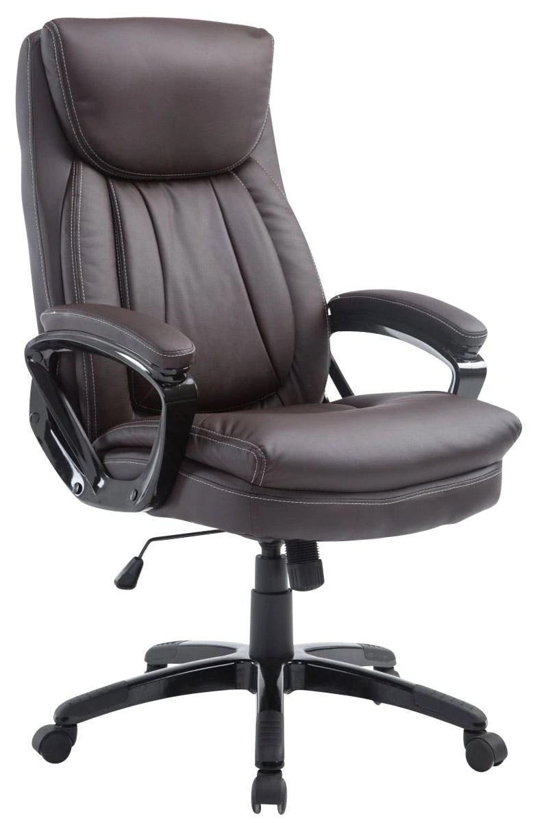 Der moderne Komfort-Chefsessel Platon mit Kunstlederbezug bietet den Vorteil, dass er besonders pflegeleicht ist. Kunstleder sieht nicht nur schön aus, sondern ist elastisch und zieht sich bei Entlastung wieder glatt, somit ist eine hohe Lebensdauer des Sitzbezuges garantiert. Die extra hohe Rückenlehne mit ausgeformtem Polster im Kopfbereich, aber auch die weiche Polsterung der Armlehnen, ermöglichen ein angenehmes Arbeiten. Die stufenlos verstellbare Sitzhöhe sowie der individuell arretierbare Wippmechanismus sorgen für mehr Bewegungsfreiheit. Das Gestell des Drehstuhls besteht aus stabilem Kunststoff und steht auf fünf robusten Kunststofflaufrollen. Egal ob Hart- oder Teppichböden – Sie werden immer leicht und locker über den Boden rollen können. Der Bürostuhl wird zerlegt angeliefert.