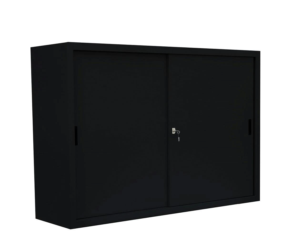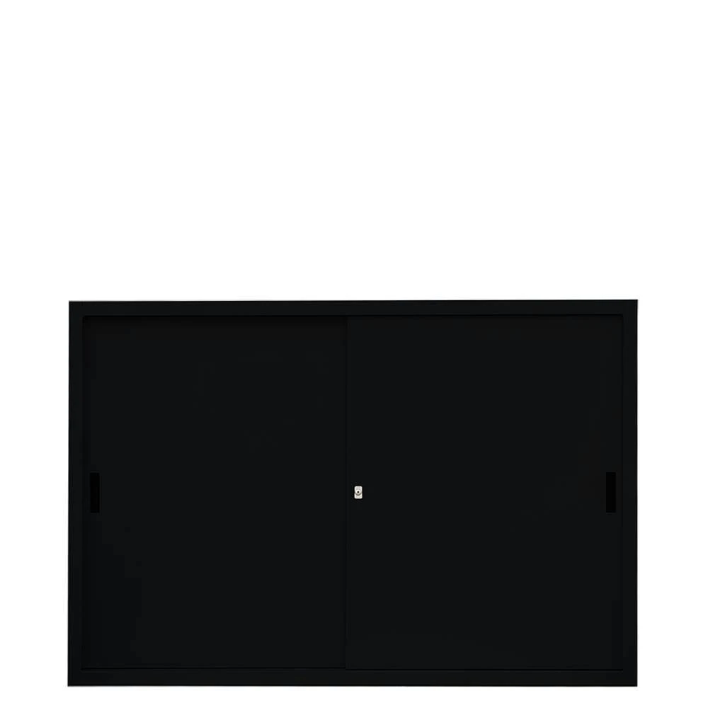 Großer Schiebetürenschrank / Sideboard Büro Aktenschrank Sideboard aus Stahl schwarzLanglebige, pflegeleichte, verschweißte Stahl-Konstruktion Optimal geeignet für enge Raumverhältnisse 2 x 2 Fachböden (Trennwand in der Mitte), 3 Ordnerhöhen Leichtläufige Schiebetüren in Schienenführung mit Kugellagerrollen und praktischen Griffmulden Serienmäßig mit geräuschdämpfenden Anschlagspuffern Fachböden im Raster höhenverstellbar Fachbodentragkraft bis 50 kg Fachböden serienmäßig in Korpusfarbe ausgeführt Bis 10 mm höhenverstellbare Drehfüße zum Niveauausgleich Dreh-Druckzylinderschloss inkl. 2 Schlüssel Korpus und Schubladen elektrostatisch, glatt pulverbeschichtet Qualität und Sicherheit Lieferung: Komplett verschweißt, keine Montage erforderlich Maße: 1090 x 1600 x 450 mm (HxBxT)Farbe: Korpus in RAL 9005 Tiefschwarz, Türen in RAL 9005 Tiefschwarz