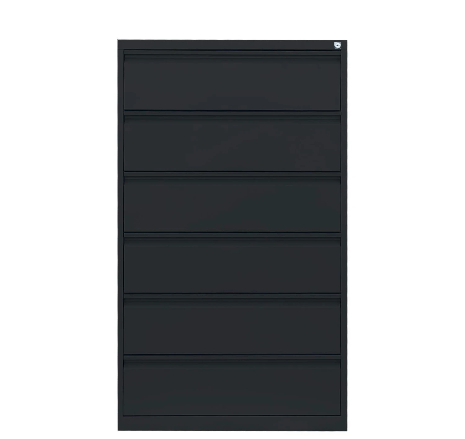 Hochwertiger Profi Stahl-Karteischrank/Karteikartenschrank dreibahnig für Ihr Home Office oder im professionellen Büro-Einsatz. Der Stahl-Karteikartenschrank ist mit 6 dreibahnigen Schubladen und einer Stahl-Abdeckplatte ausgestattet und bietet Stauraum für DIN A5 Karteikarten.Schubladen mit geschlossenen Böden, auf Präzisions-Teleskopführungen sind zu fast 100% ausziehbar und mit Auszugssperren versehen. Die Auszugssperren verhindern des gleichzeitigen Öffnen aller Schubladen und somit das Umkippen des Schrankes. Die durchgehende Griffleiste ermöglicht ein leichtes und angenehmes Öffnen der Schubladen. Die Schubladen sind zentral verschließbar durch ein Zylinderschloss inkl. 2 Schlüssel. Aufklebbare Etikettenfenster sind beiliegend. Der Schrank ist fertig montiert. Der Korpus und die Schubladen sind pulverbeschichtet. Maße: 1320 x 760 x 620 mm (Höhe x Breite x Tiefe) Material: Langlebige, geschweißte Stahlblechkonstruktion Farbe: RAL 9005 Schwarz