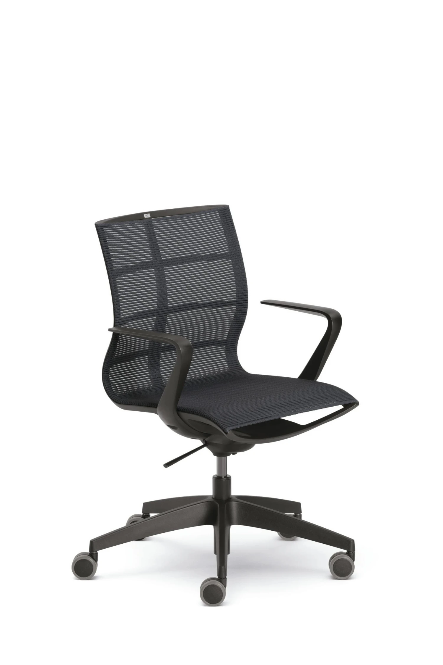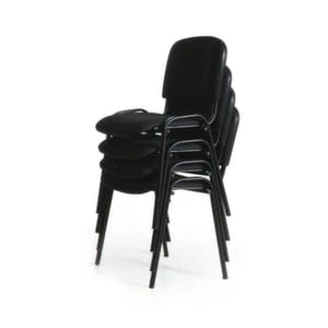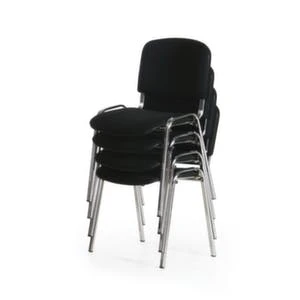 Konferenzstuhl, 4-Fußgestell aus Rundrohr-Stahl mit Pulverbeschichtung in schwarz, ohne Armlehnen, Sitz mit Komfortpolster, Sitzbezug aus Stoff (100% Polyester) in schwarz, Rückenbezug aus Stoff (100% Polyester) in schwarz, stapelbar.