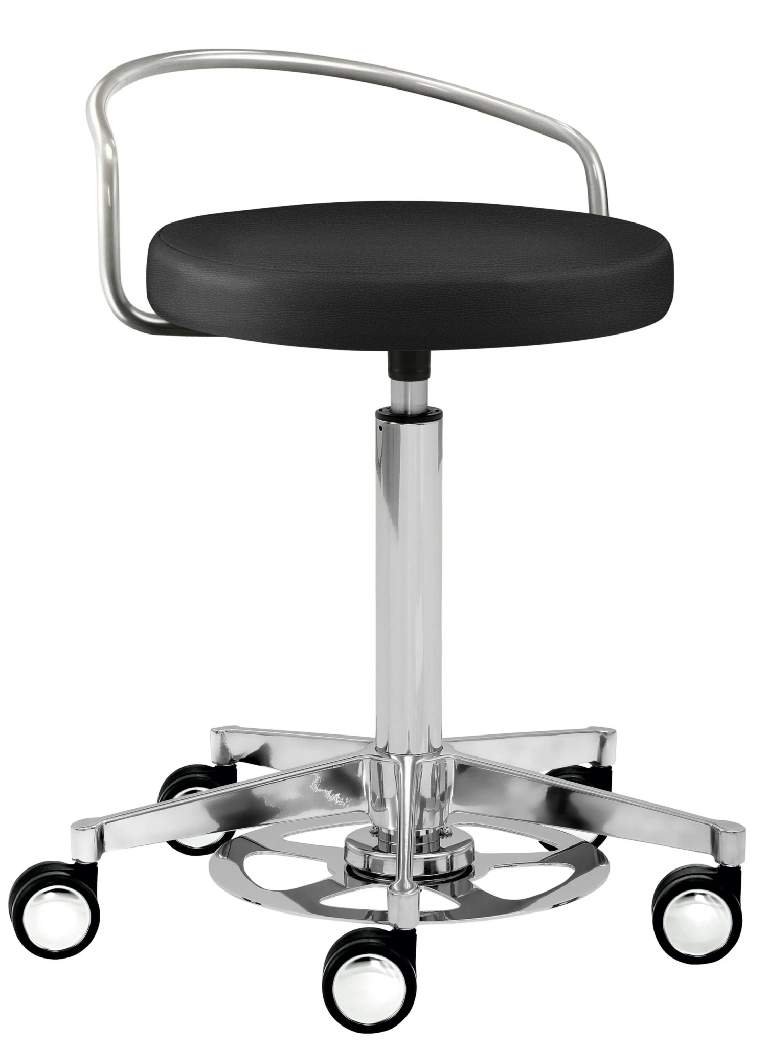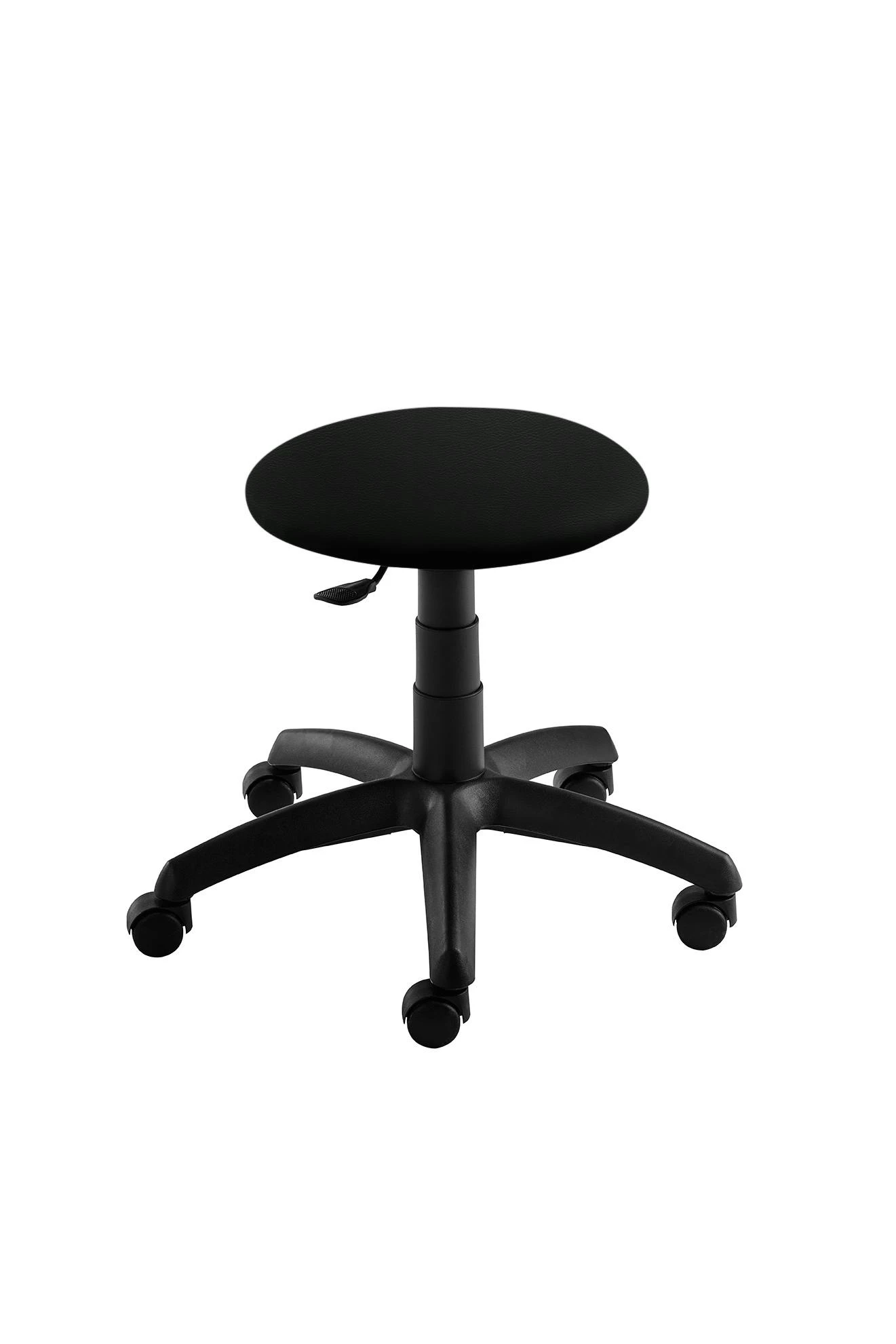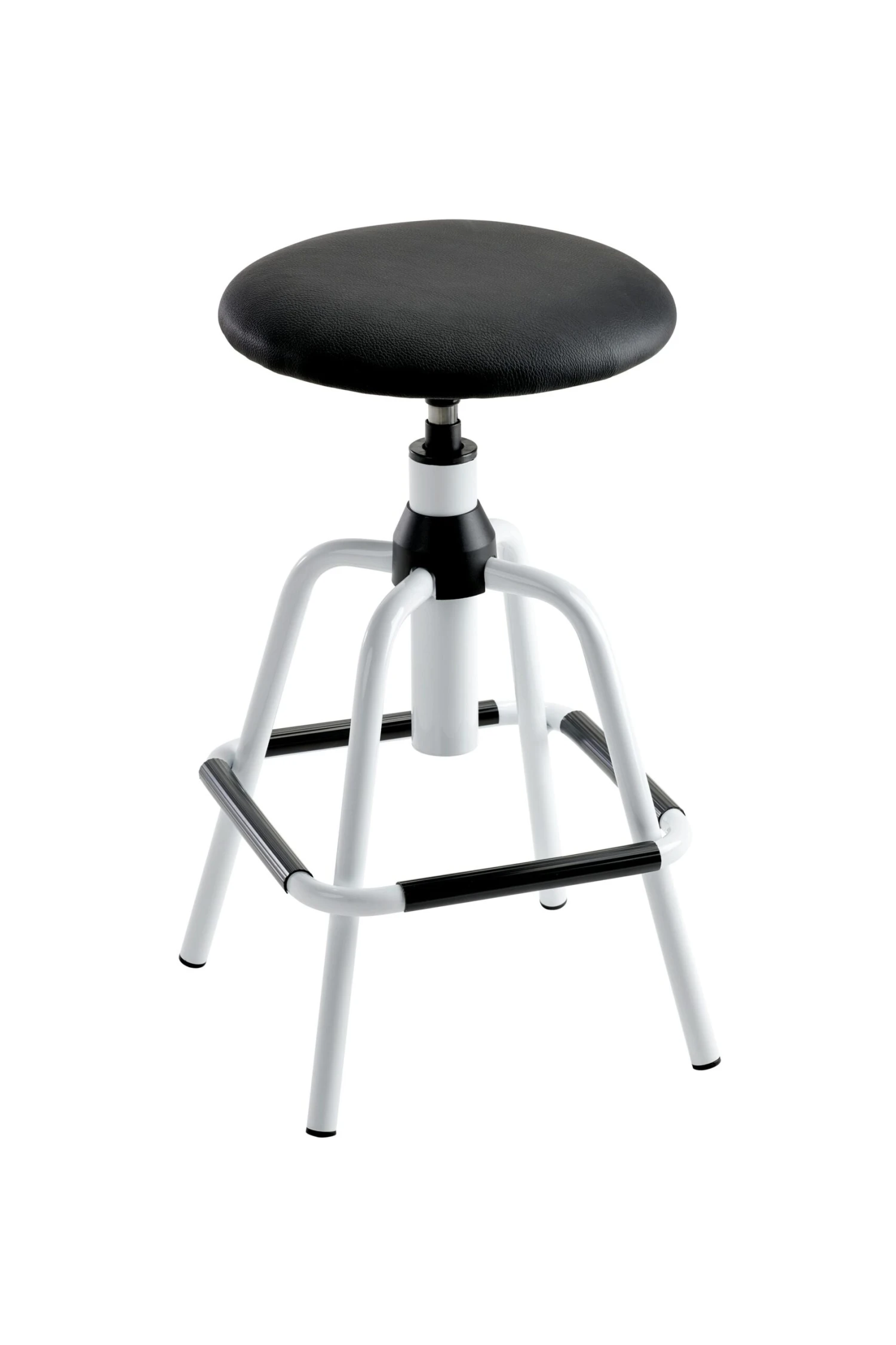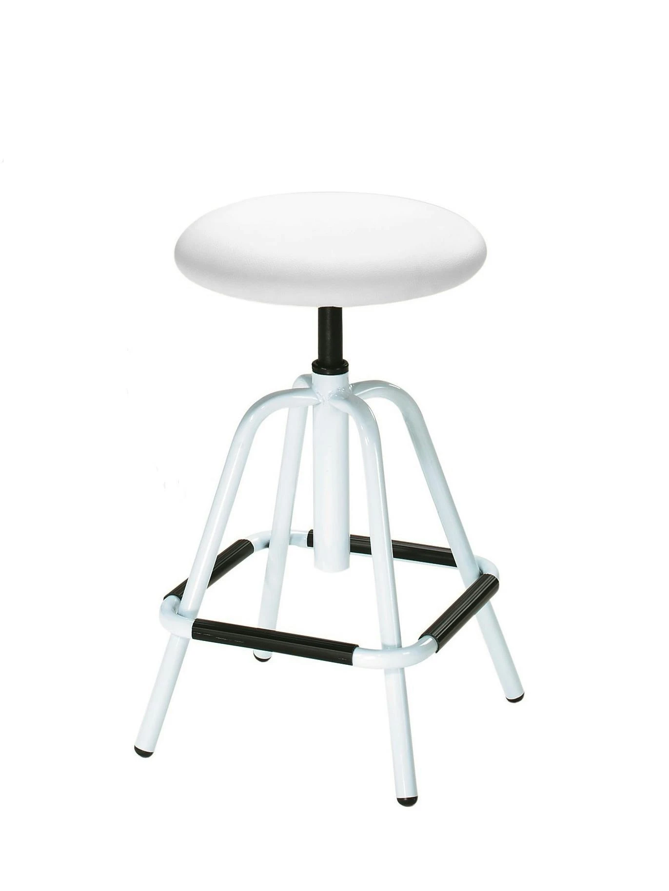 Gestell weiß, Spindel-Höhenverstellung, Sitz gepolstert, Sitzhöhe 56 – 73 cm.