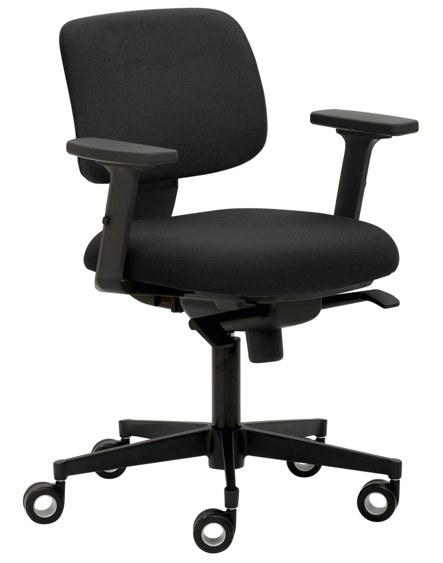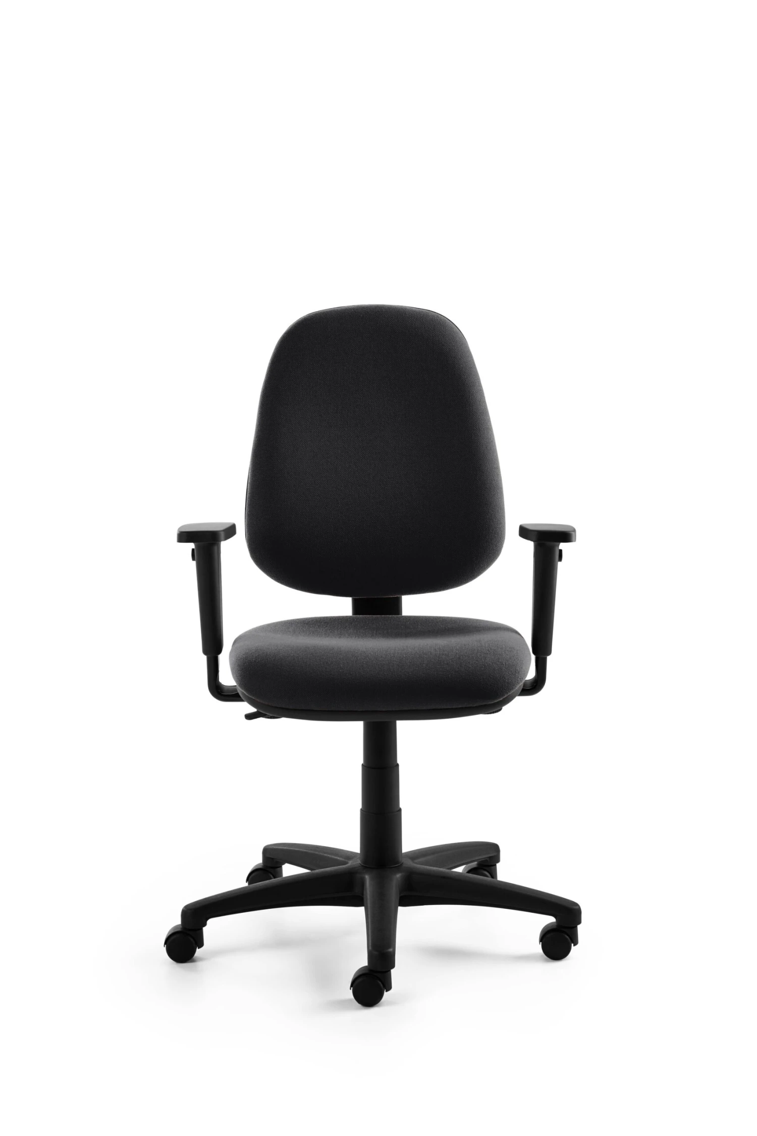 Gestell schwarz, mittlerer Rücken, Standard-Mechanik, Rücken in Tiefe und Höhe verstellbar, stufenlose Höhenverstellung durch Gasfeder, 360° drehbar, Kunststoff-Fußkreuz schwarz, inkl. Rollen für Teppichboden, Sitzhöhe 42 – 53 cm.