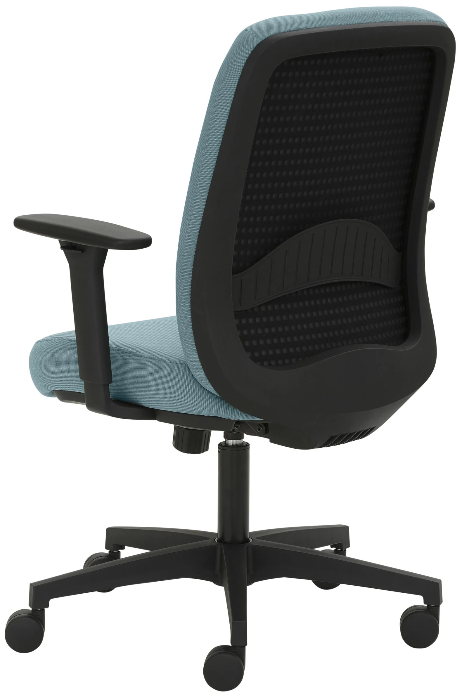 Niedriger Rücken, Sitz und Rücken gepolstert, extra stark gepolsterte Sitzfläche für ein Maximum an Komfort, Synchronmechanik mit individueller Gewichtseinstellung, höhenverstellbare Lordosenstütze, Kunststoff-Fußkreuz schwarz, stufenlose Höhenverstellung, Gasfeder schwarz, inkl. Rollen für Teppichböden, Stuhl GS-zertifiziert, Typ C nach DIN EN 1335 – 1 (belastbar bis max. 110 kg). Sitzhöhe 47 – 58 cm. Höhenverstellbare Armlehnen schwarz.
