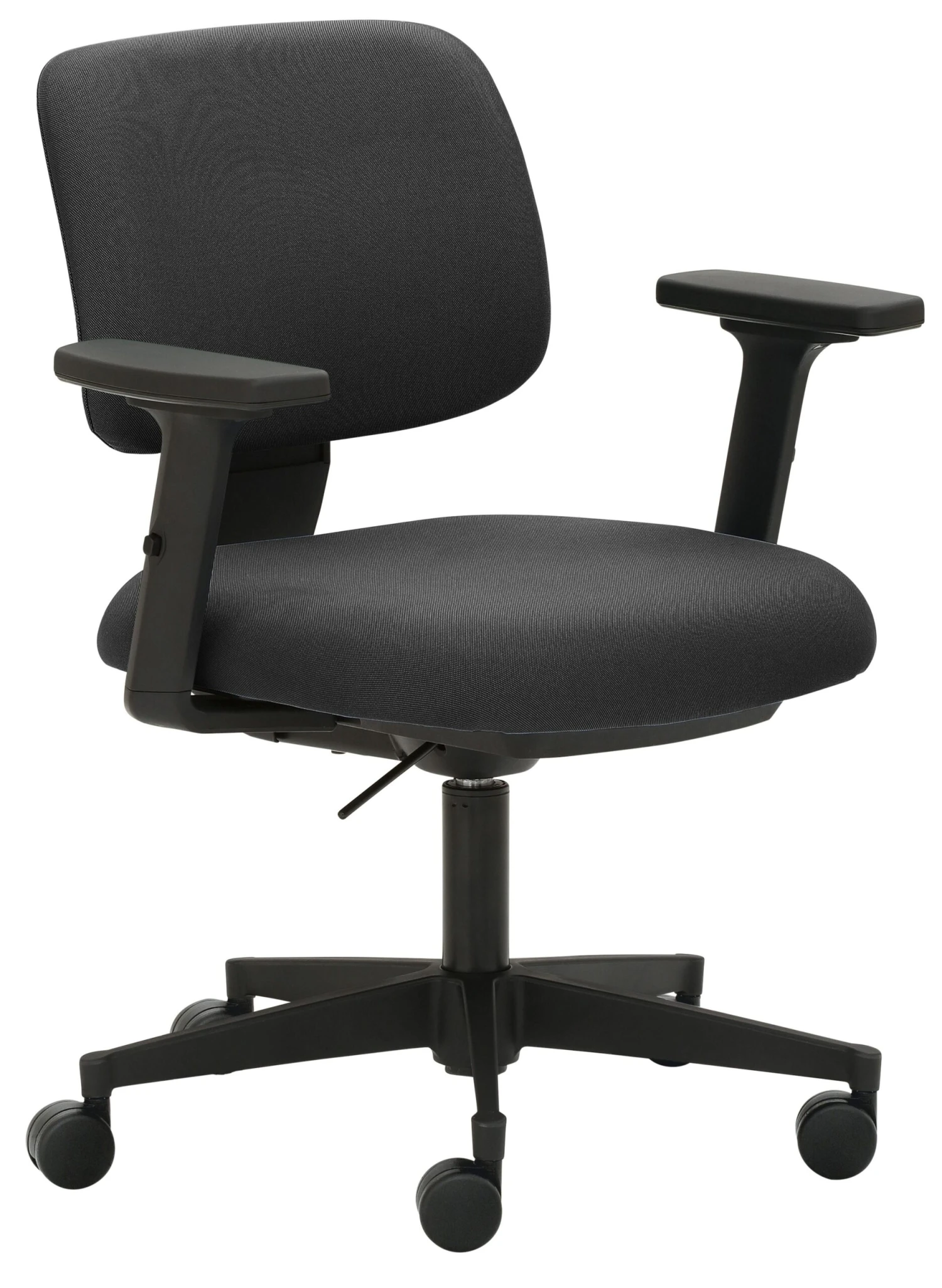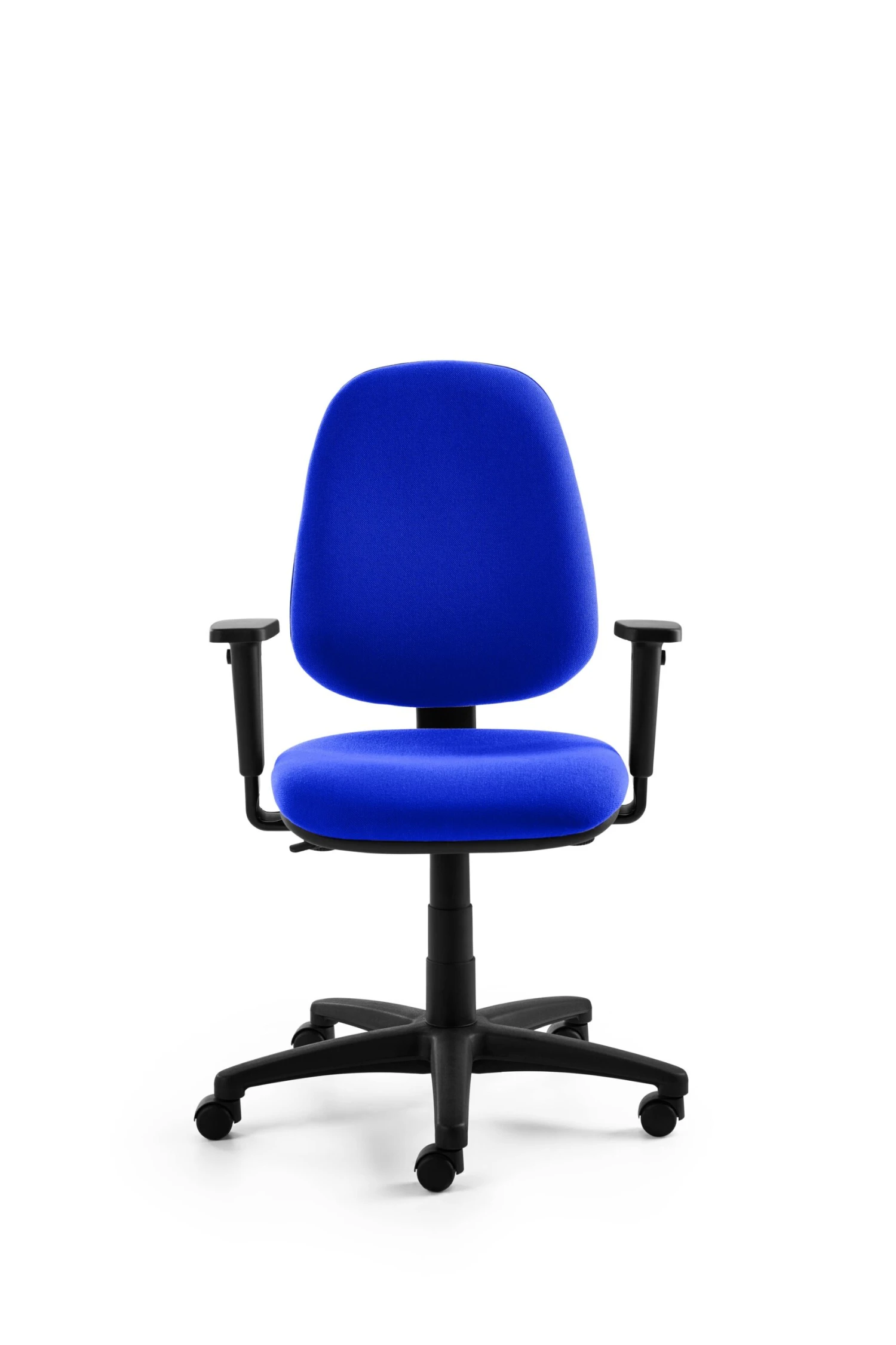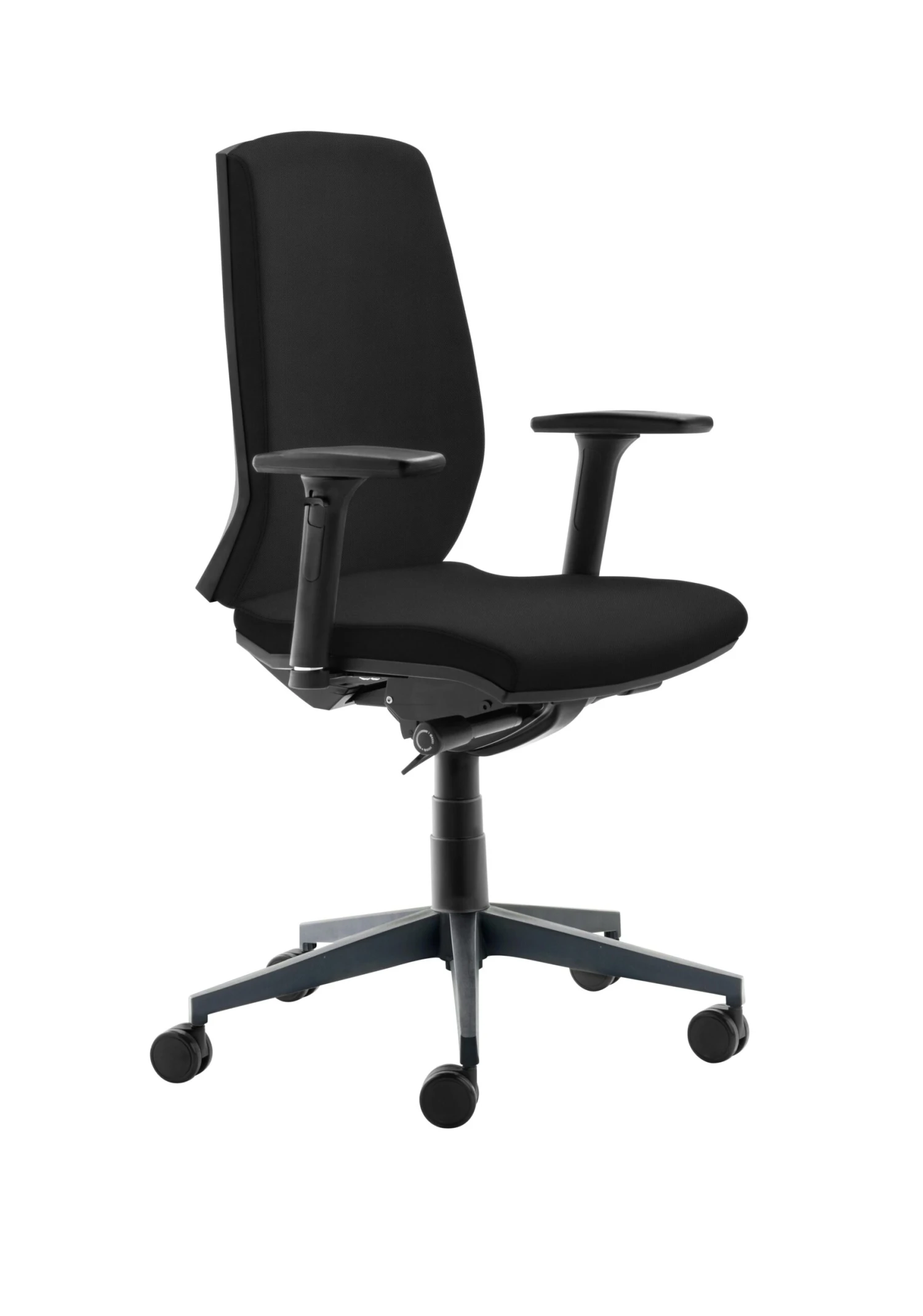 Hoher Rücken, Rückenhöhe 7-fach verstellbar, Synchronmechanik mit individueller Gewichtseinstellung und Sitztiefenverstellung, stufenlose Höhenverstellung durch Gasfeder, Kunststoff-Fußkreuz und Kunststoffteile schwarz, inkl. große Rollen für Teppichböden, Sitzhöhe 47 – 57 cm.