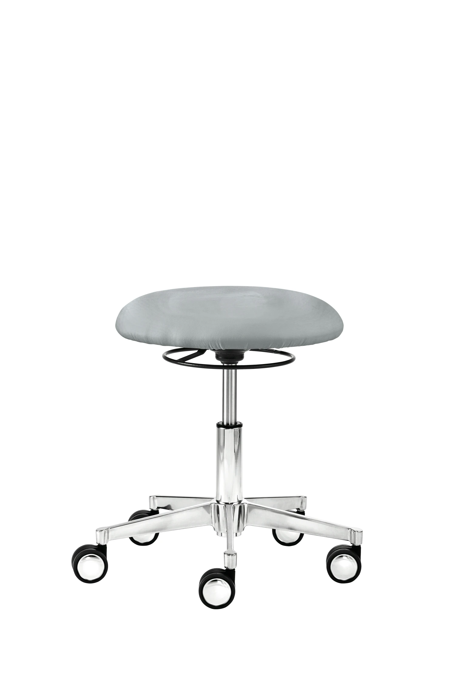 Tellersitz und Rücken gepolstert, Rückenlehne/Armauflage 360° drehbar und höhenverstellbar, Rücken-Raster-Höhenverstellung, Höhenverstellung in Rastertechnik, Rückenhalterung und Ringauslöser pulverbeschichtet schwarz, Polyamid-Fußkreuz schwarz (ø 61 cm), stufenlose Höhenverstellung durch Gasfeder, inkl. Rollen für Teppichböden, Sitzhöhe 40 – 48 cm.