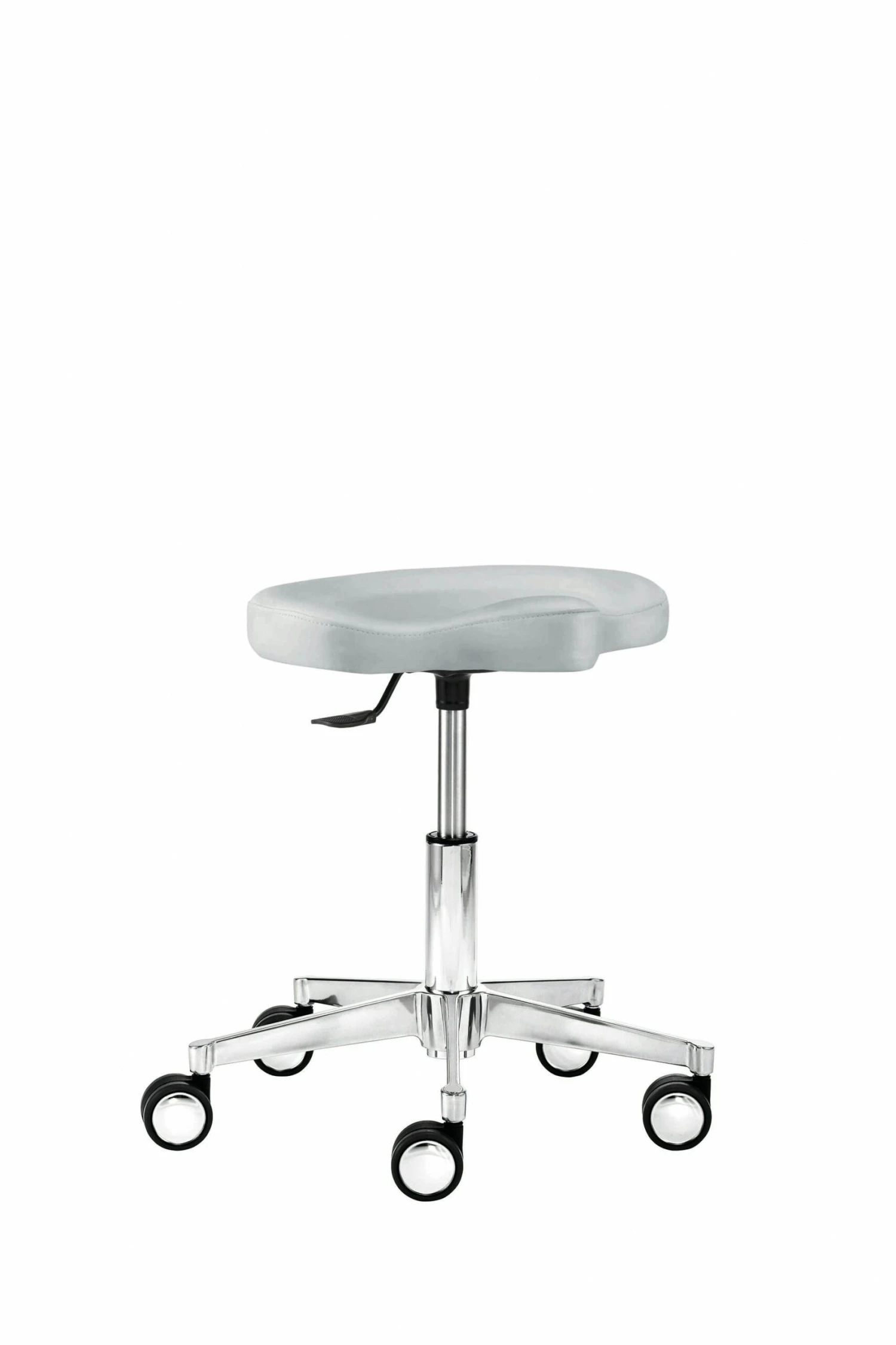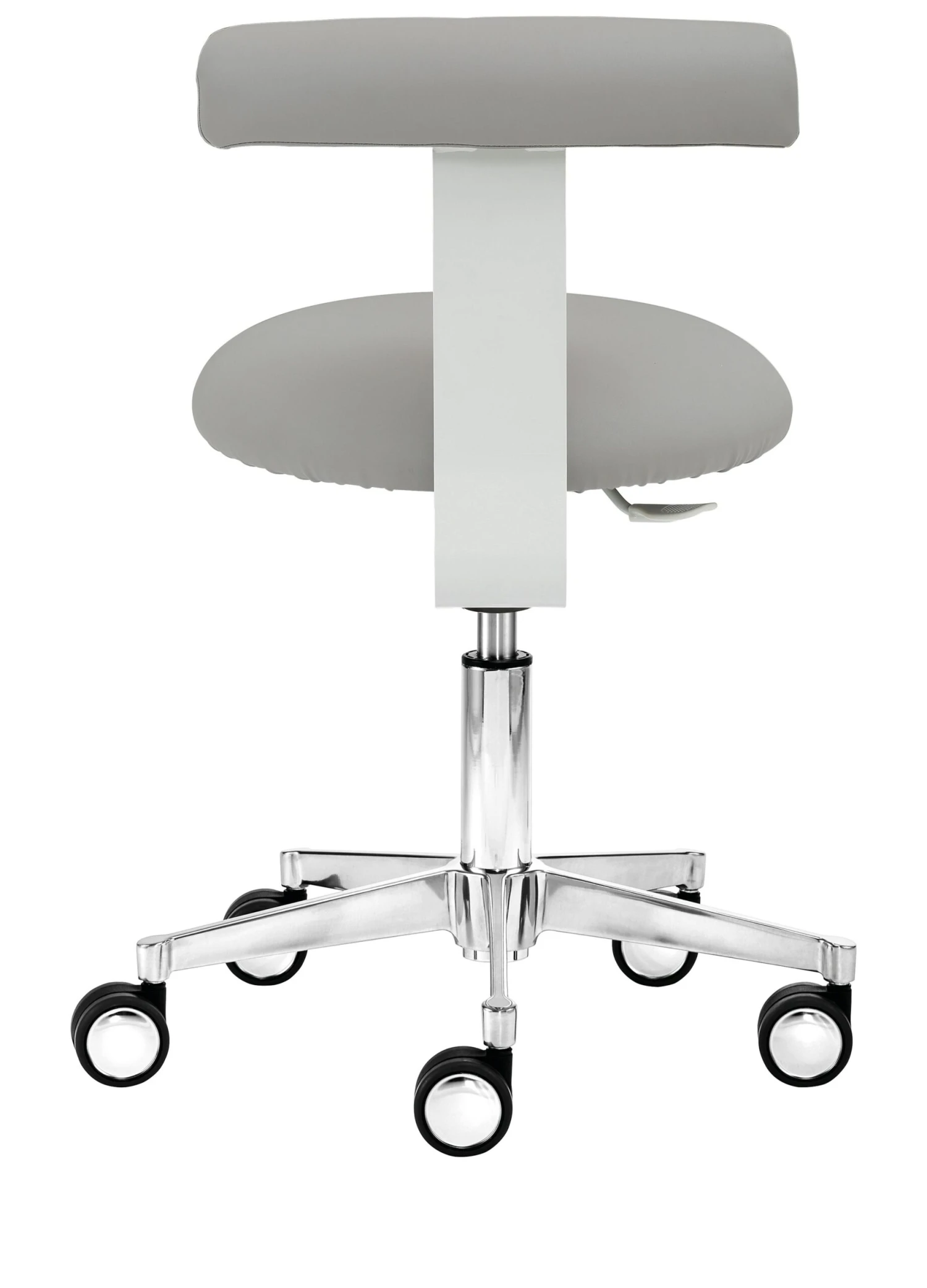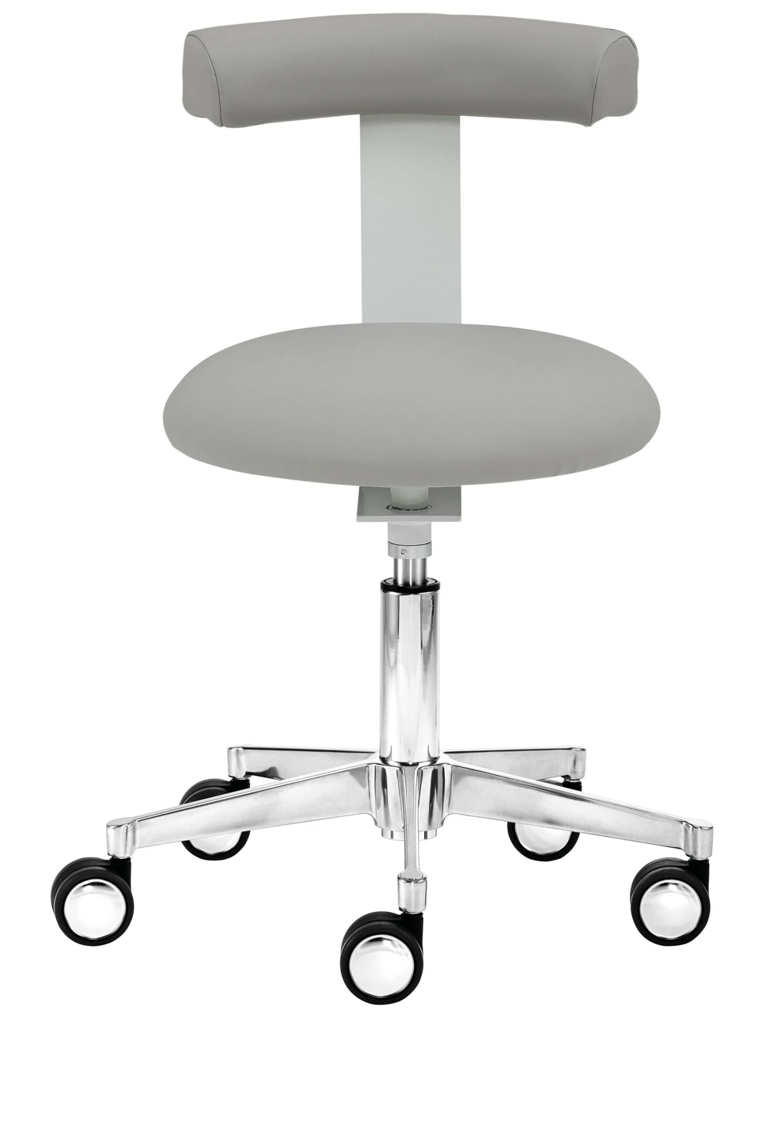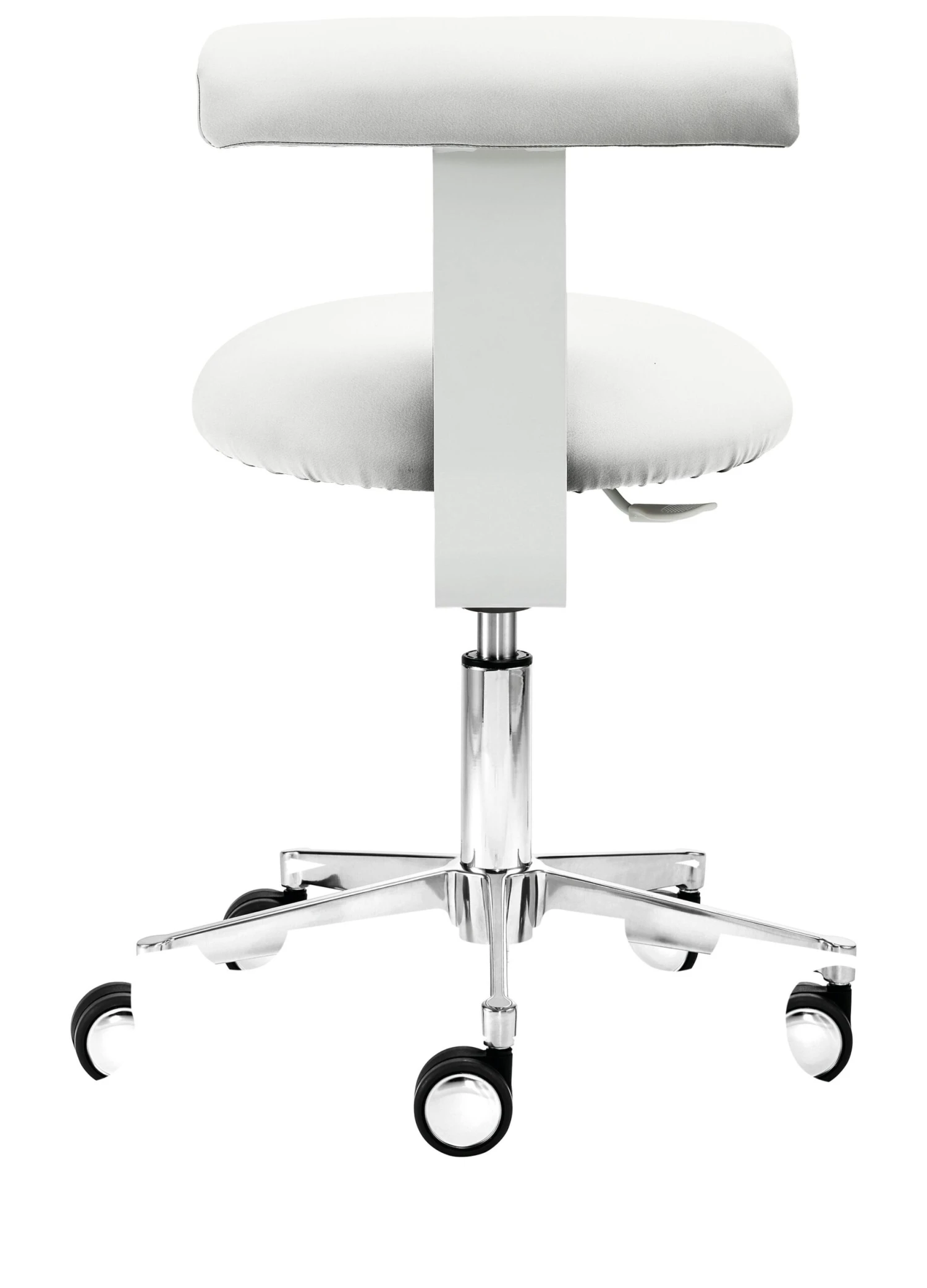 Mit kleinem Rückenbügel, Tellersitz und Rücken gepolstert, Rückenhalterung pulverbeschichtet, Bewegungsfreiheit 360°, Rückenlehne/Armauflage 360° drehbar, Hebelauslöser, stufenlose Höhenverstellung durch Gasfeder, Alu-Fußkreuz (ø 52 cm), inkl. Hartbodenrollen mit Chromblende, Sitzhöhe 45 – 52,5 cm.