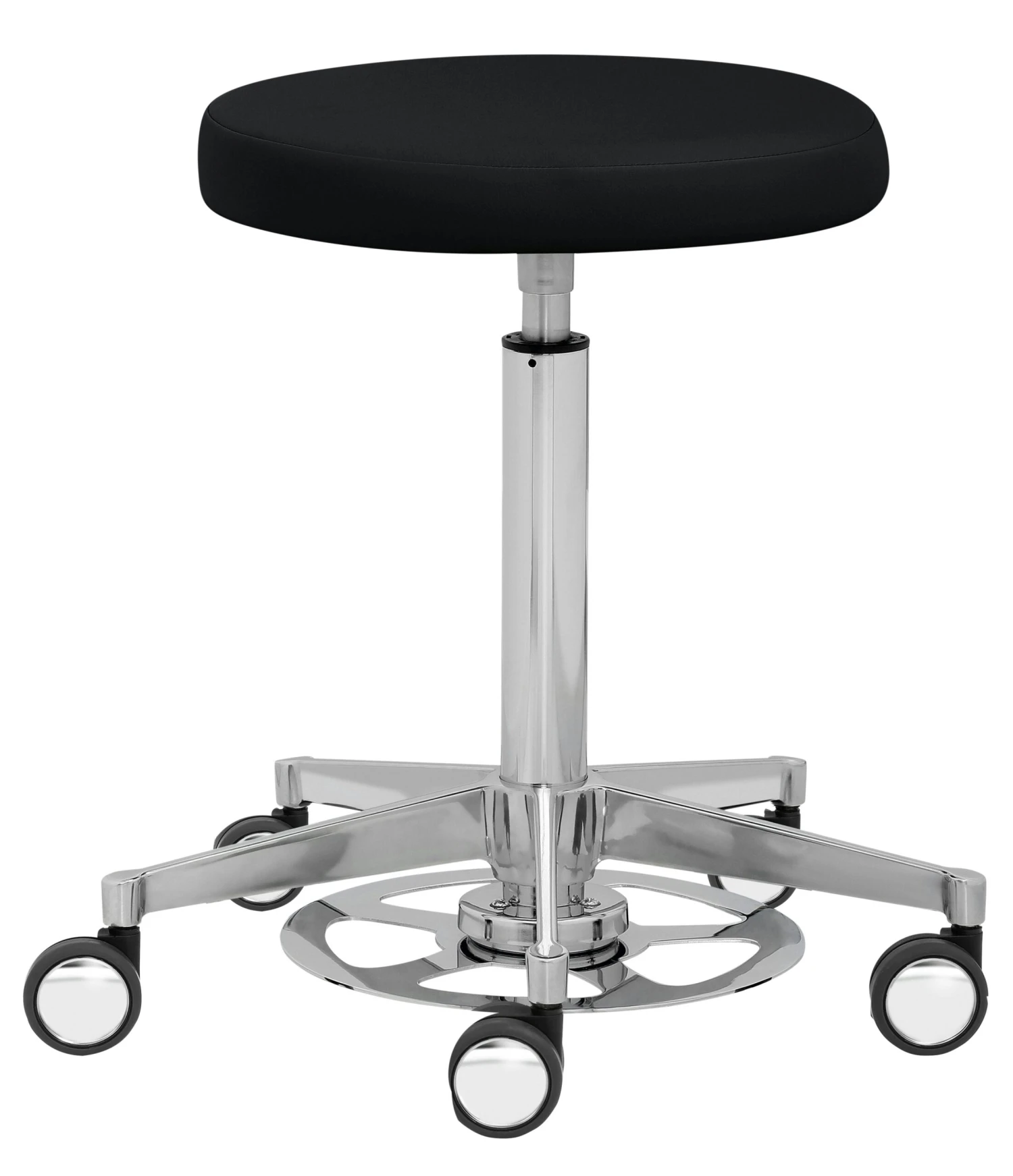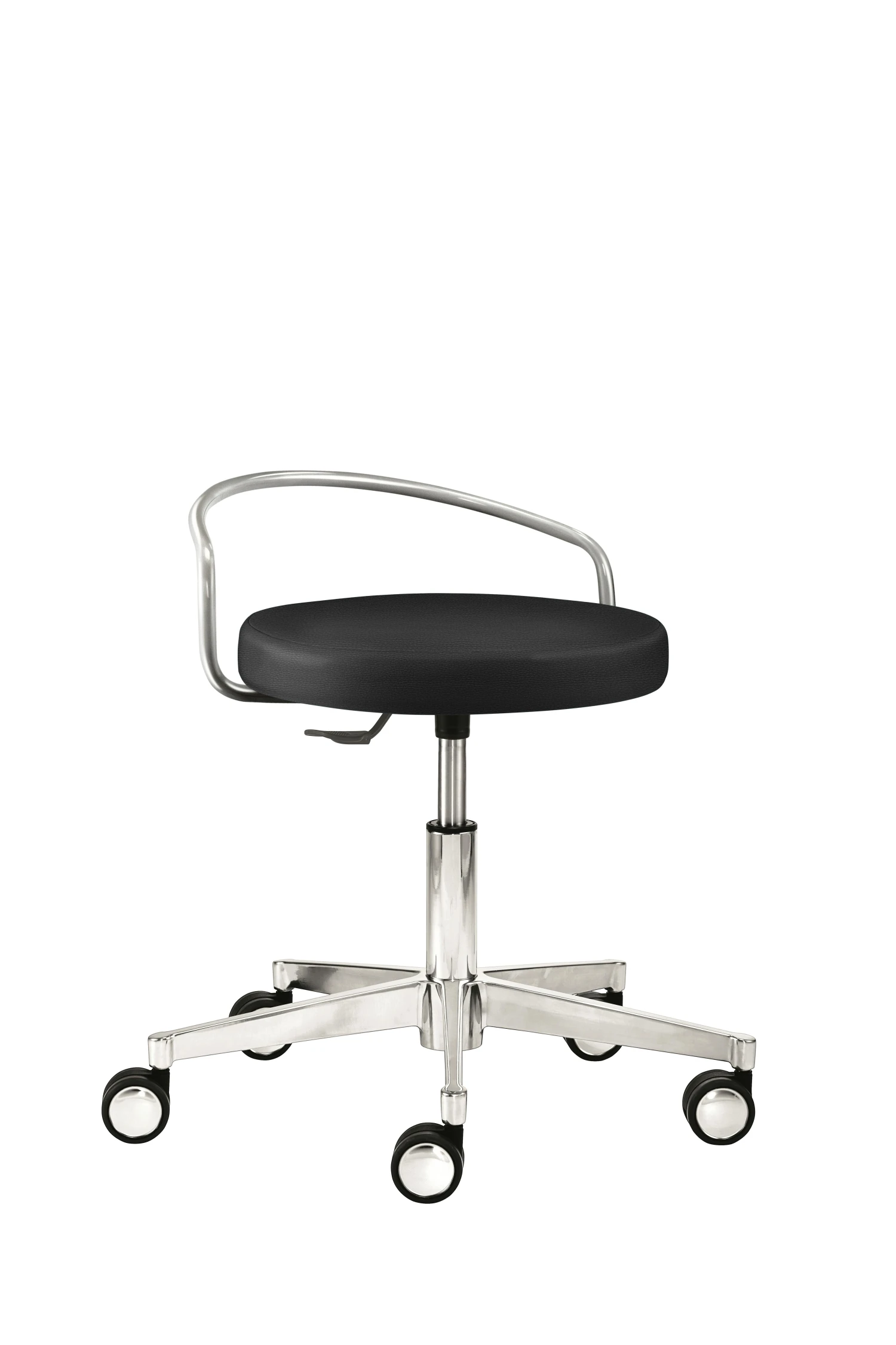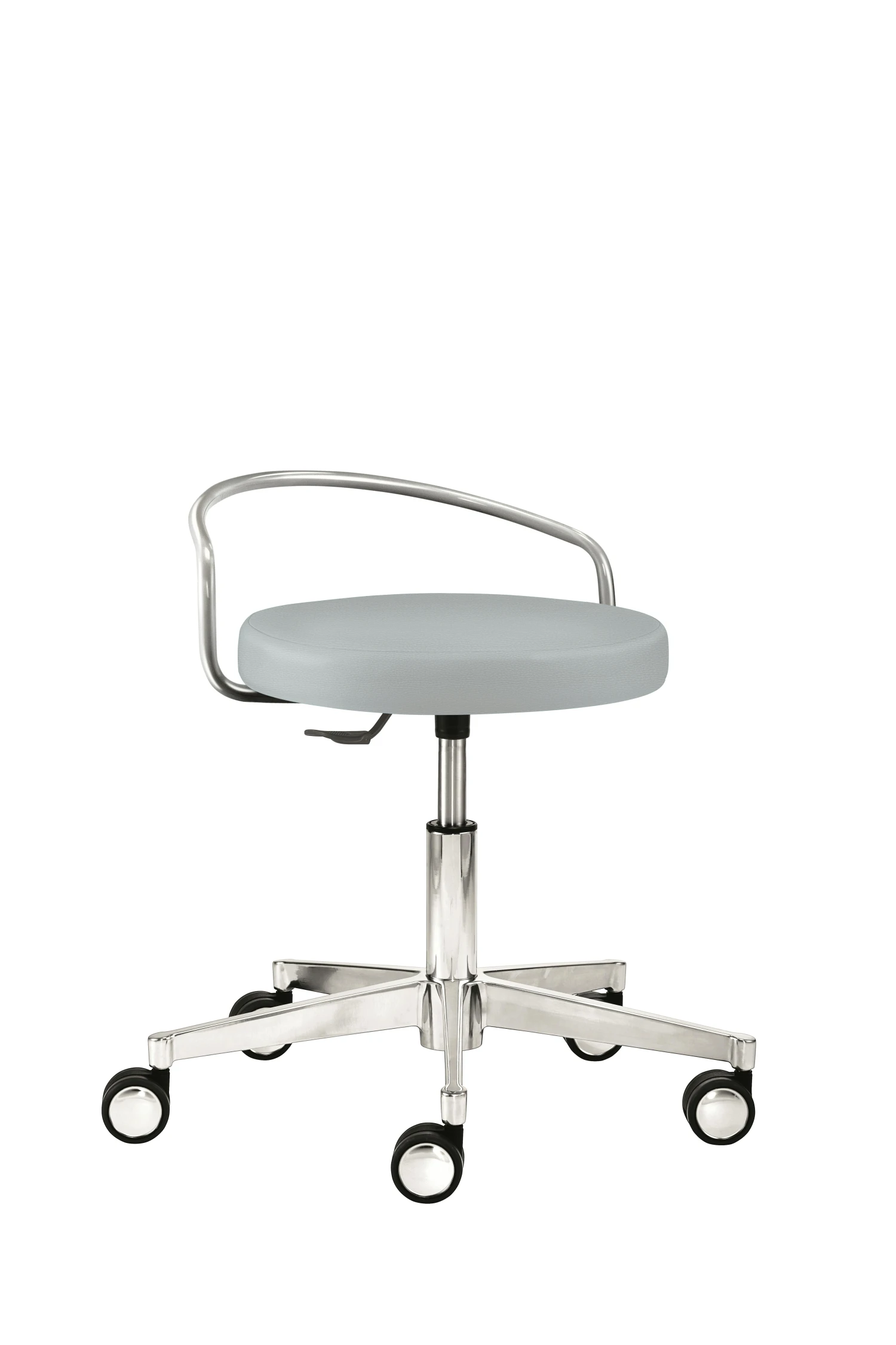 Sitz mit Rückenbügel, stufenlose Höhenverstellung durch Gasfeder, Bewegungsfreiheit 360°, Hebelauslöser, Alu-Fußkreuz (ø 61cm), inkl. Hartbodenrollen mit Chromblende, Sitzhöhe 41,5 – 52,5 cm.