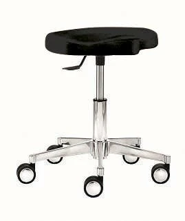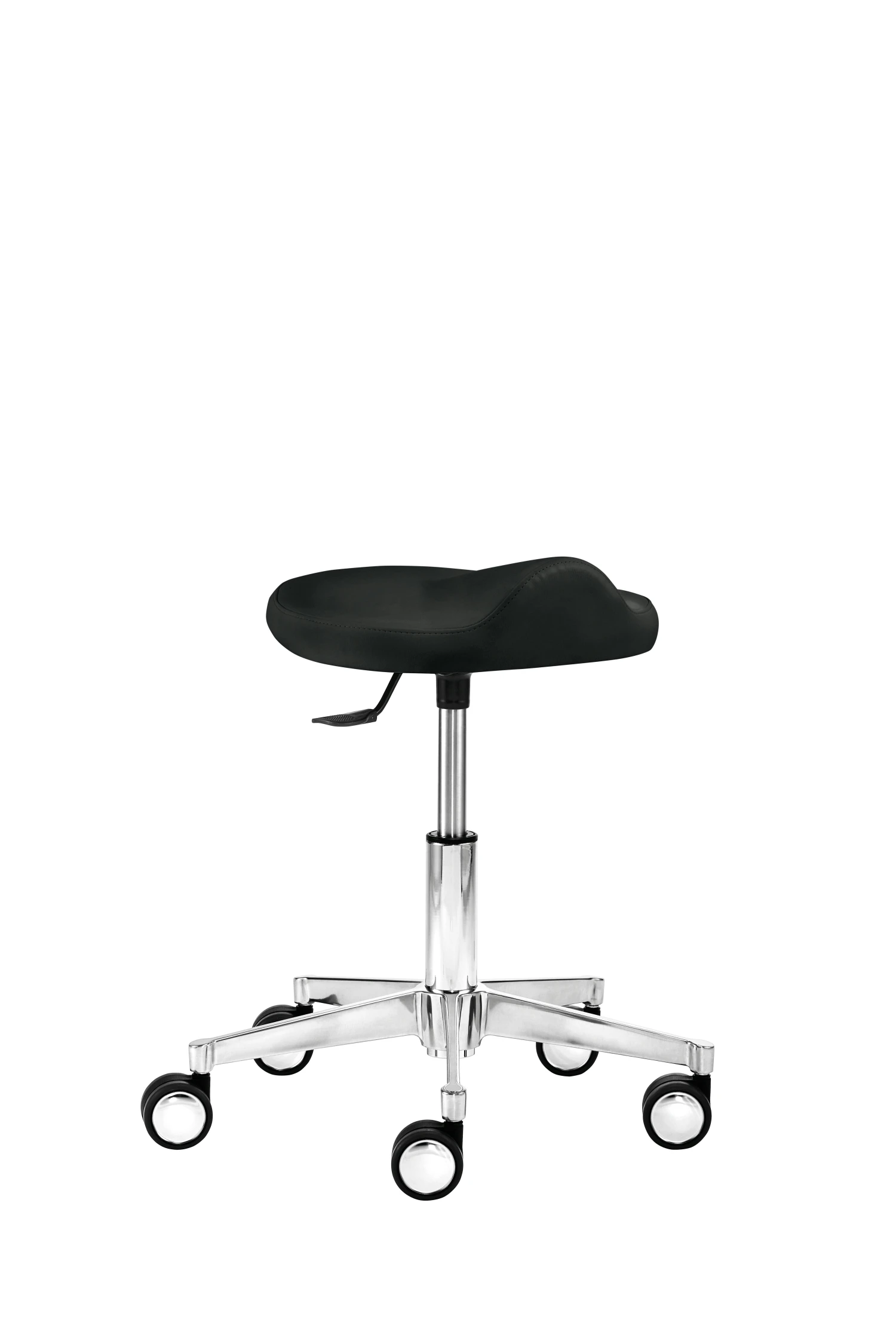 Mit gepolstertem Physioteller, hohe Chrom-Gasfeder, stufenlose Höhenverstellung, 360° Bewegungsfreiheit, Ringauslöser, Alu-Fußkreuz (ø 52 cm), inkl. Hartbodenrollen mit Chromblende, Sitzhöhe 53 – 72,5 cm.