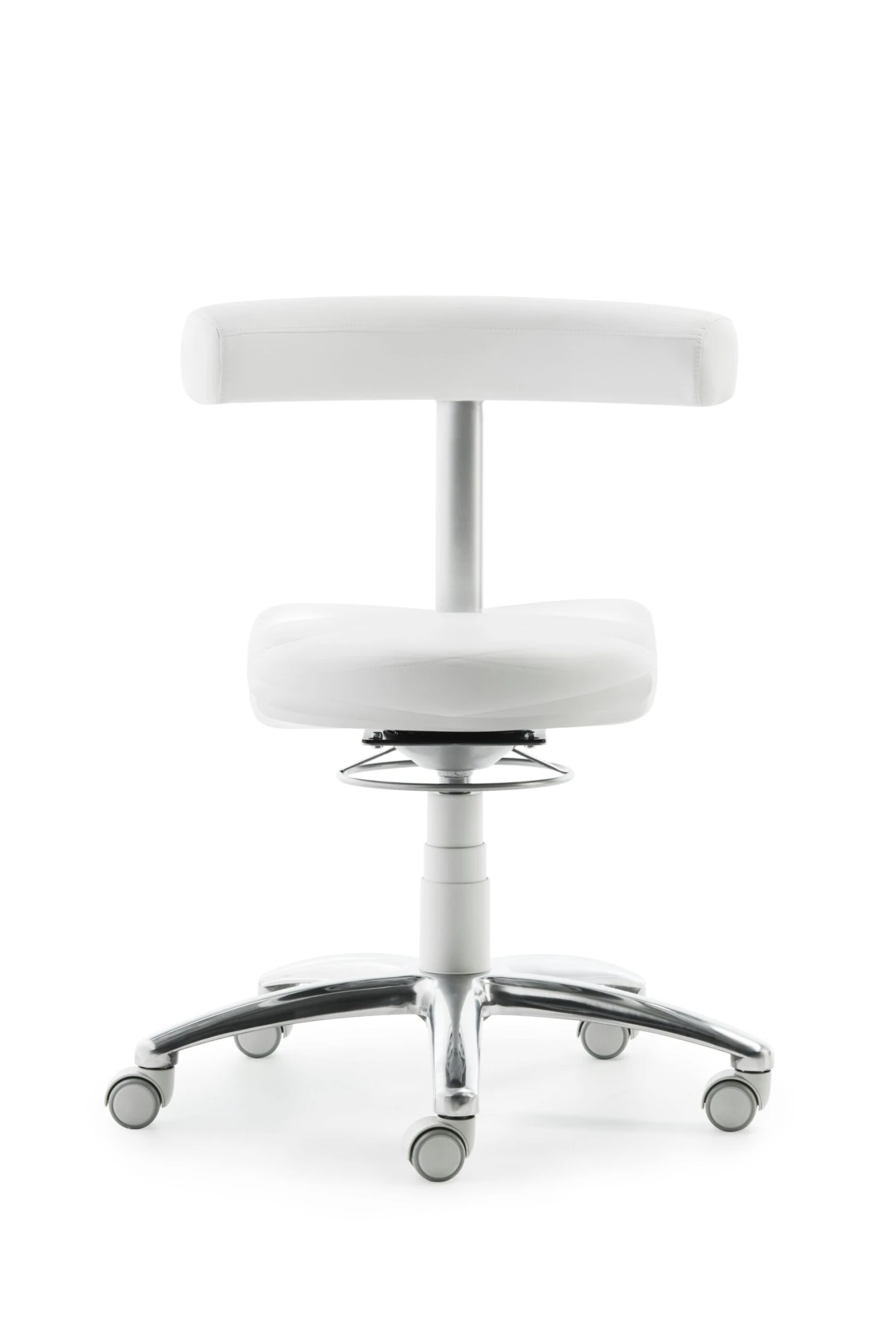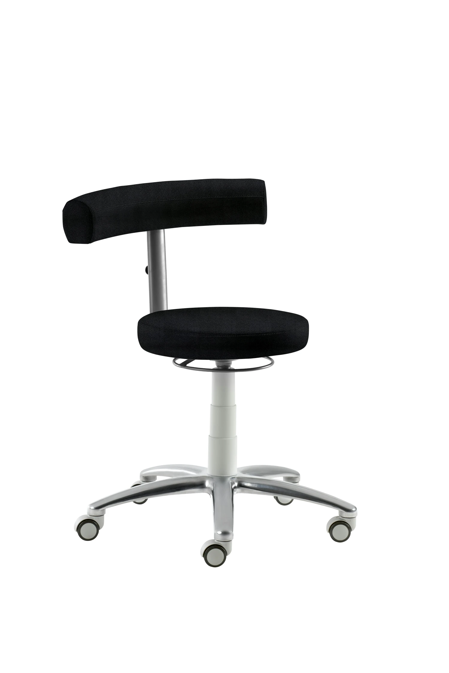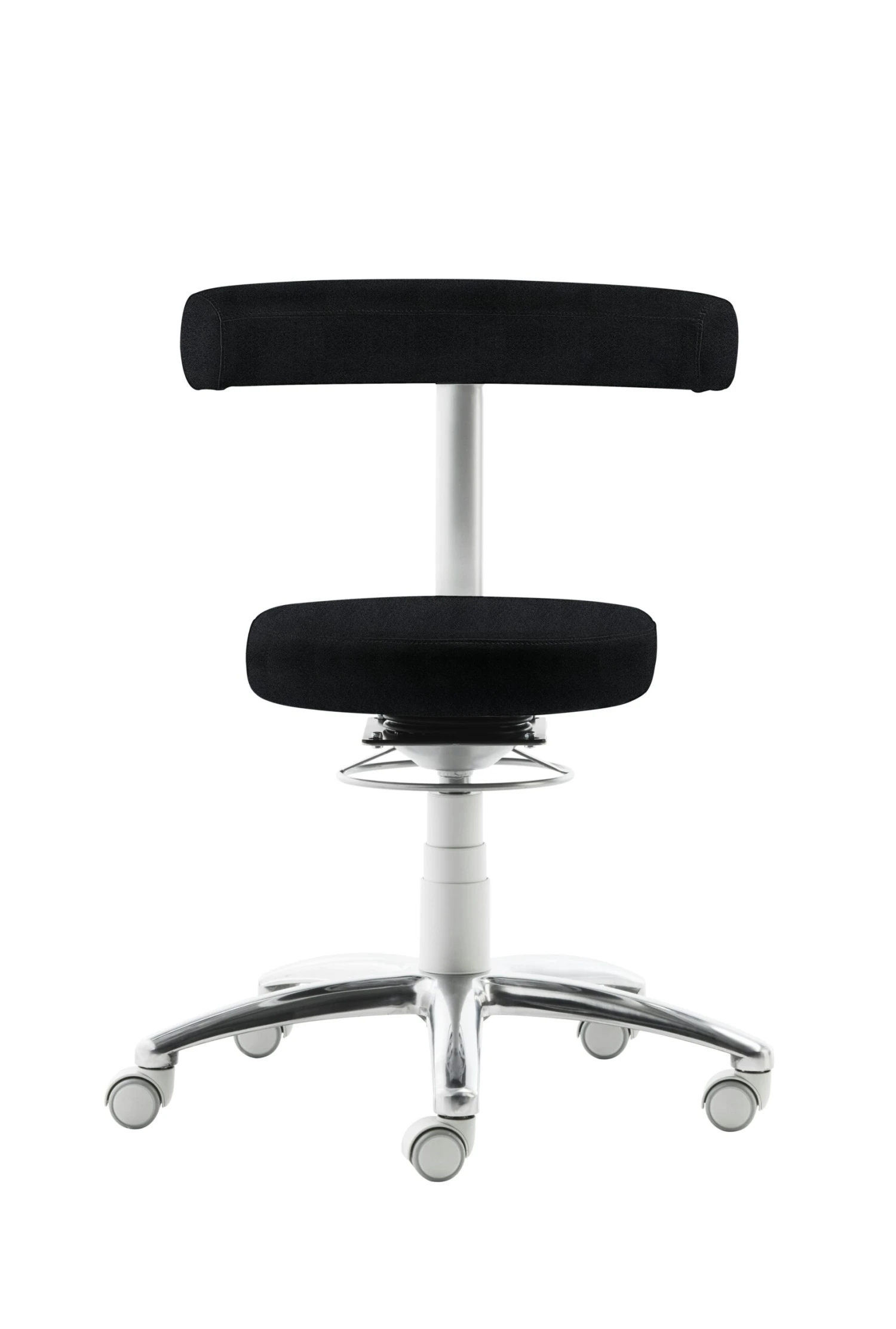 Sitz und Rücken gepolstert, Rücken-Rasterhöhenverstellung, stufenlose Höhenverstellung durch Gasfeder, Ringauslösung, Gestell lichtgrau und Alu-Fußkreuz poliert, 3D-Sitzkomfort für dynamisches Sitzen, inkl. Rollen für Hartböden, Sitzhöhe 44 – 56 cm.
