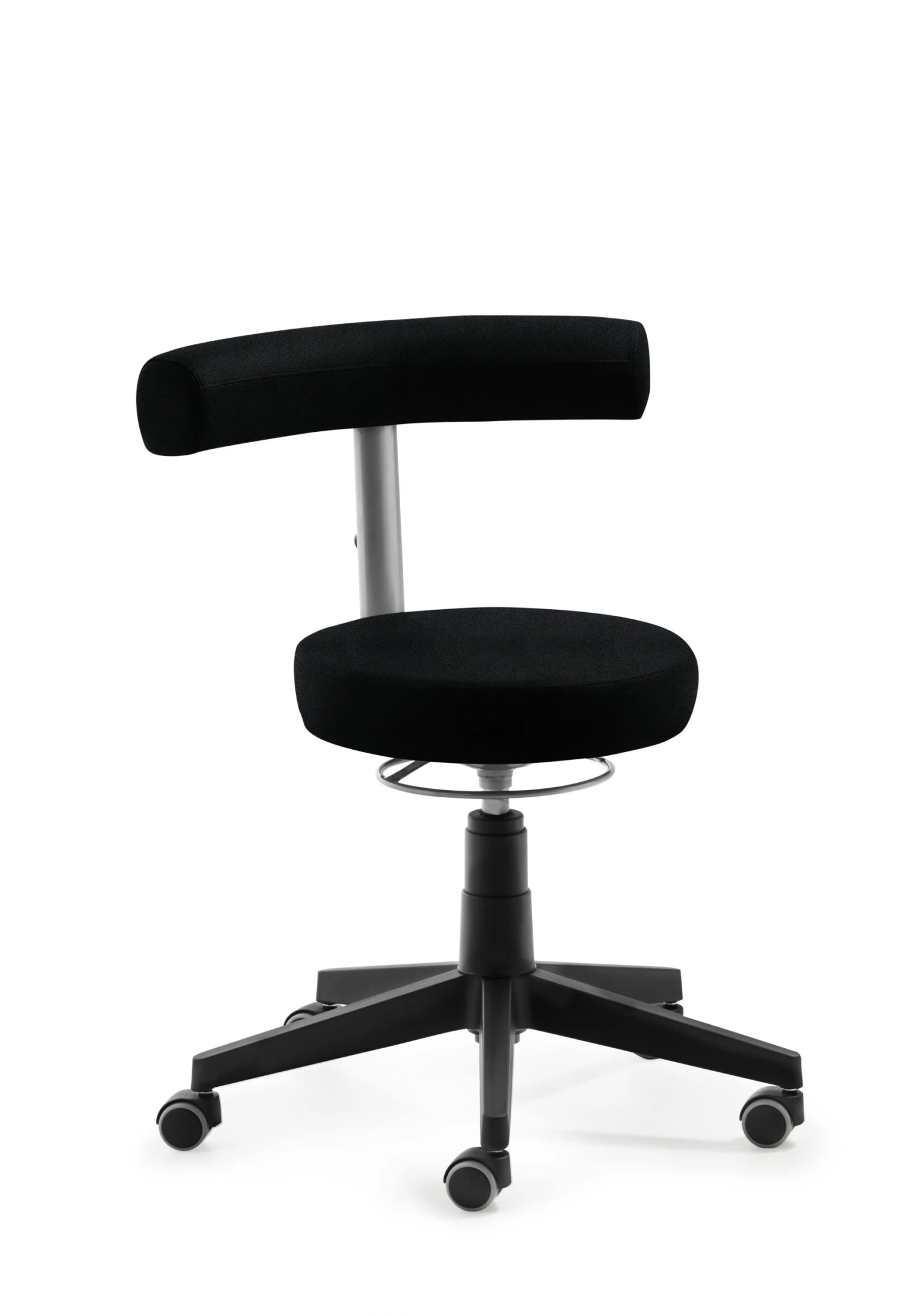 Sitz und Rücken gepolstert, unifarben oder kombiniert lieferbar, Rückenlehne/Armauflage 4-fach höhenverstellbar und um 360° drehbar, stufenlose Höhenverstellung durch Gasfeder, Ringauslösung, Kunststoff-Fußkreuz schwarz (Ø 61 cm), inkl. Rollen für Teppichböden, Sitzhöhe 40 – 50 cm (besonders niedrig).