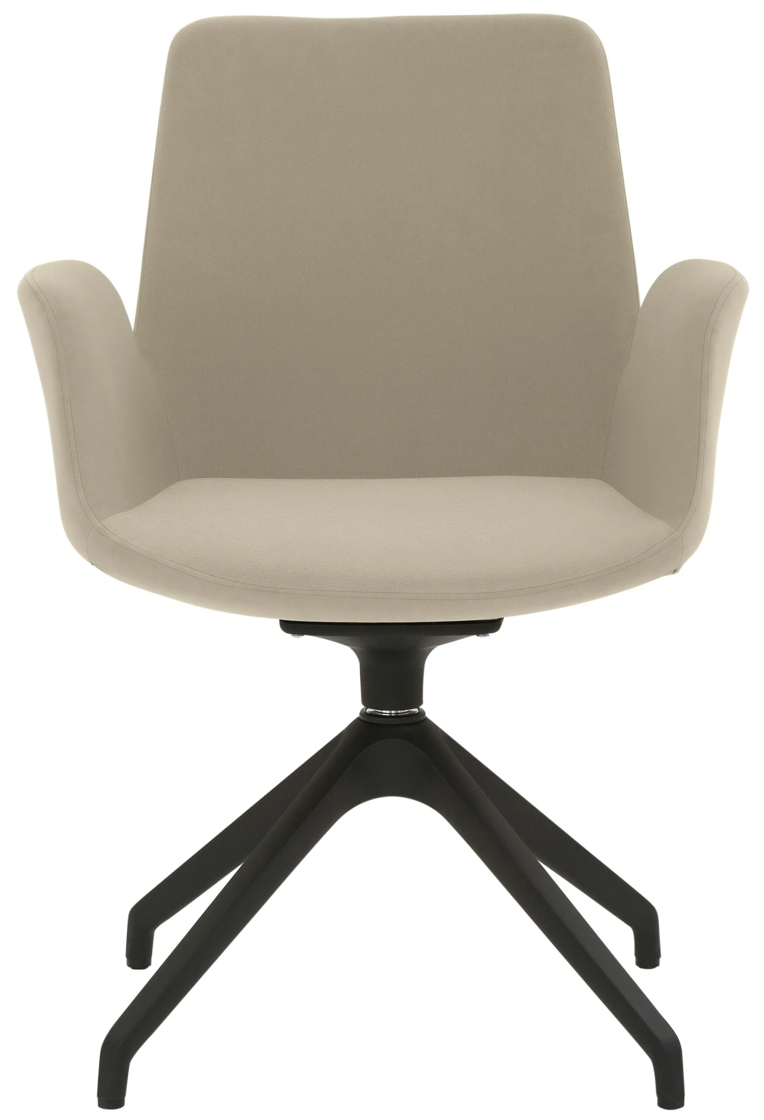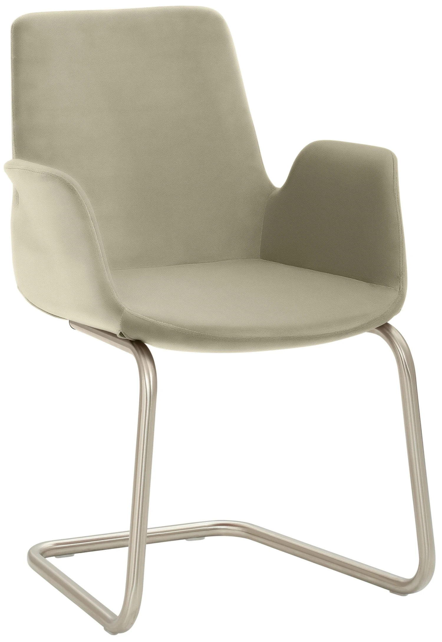 Freischwinger-Gestell, pulverbeschichtet schwarz, mit integrierten Armlehnen, rundum gepolstert, Sitzhöhe 49 cm.