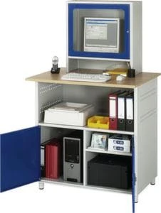 PC-Schrank, Höhe x Breite x Tiefe 1100 x 720 x 660 mm, Steckdosenleiste mit Schalter, 1 Auszugboden, 1 Schublade, Querrolllade, 4 Lenkrollen, 2 Lenkrollen mit Feststellern, Stahlkonstruktion, Korpus mit Pulverbeschichtung in RAL7035 Lichtgrau, Front in RAL7035 Lichtgrau, Platte aus Holz mit Melaminharzbeschichtung in Dekor Buche.