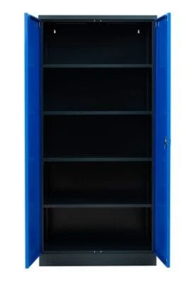 Der Stahlschrank ist komplett aus Metall gefertigt. Die Oberflächen sind aus elektrostatisch pulverbeschichtetem Metall hergestellt und dadurch besonders robust. Die vier Fachböden sind in 5 cm Abständen in der Höhe verstellbar. So bietet der Metallschrank auf insgesamt fünf Ordnerhöhen reichlich Stauraum. Der Schrank ist zusätzlich abschließbar und es werden zwei Schlüssel mitgeliefert.