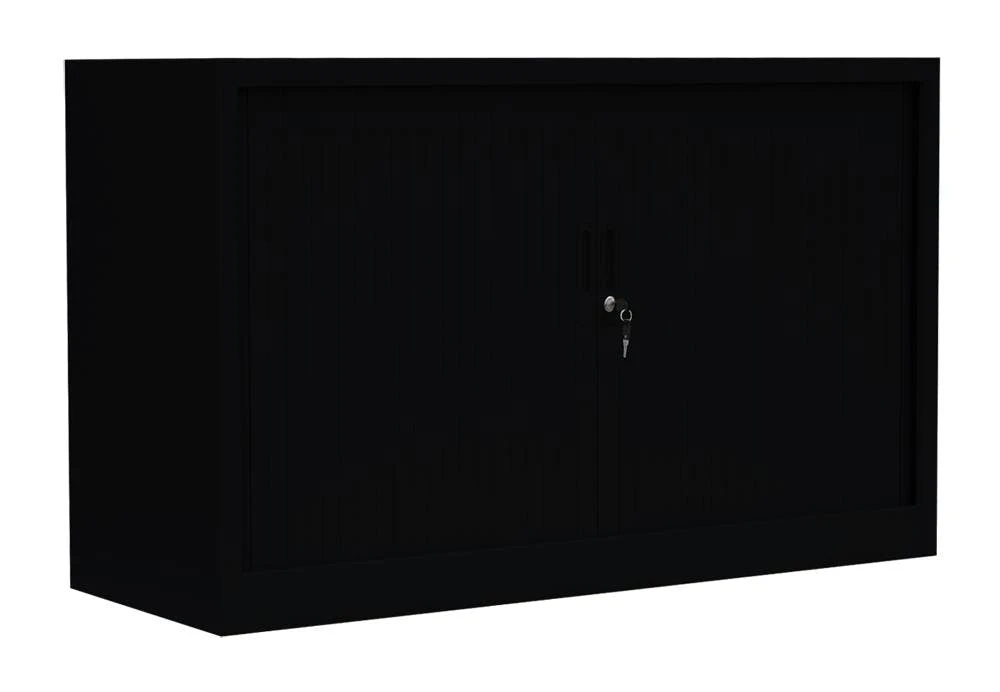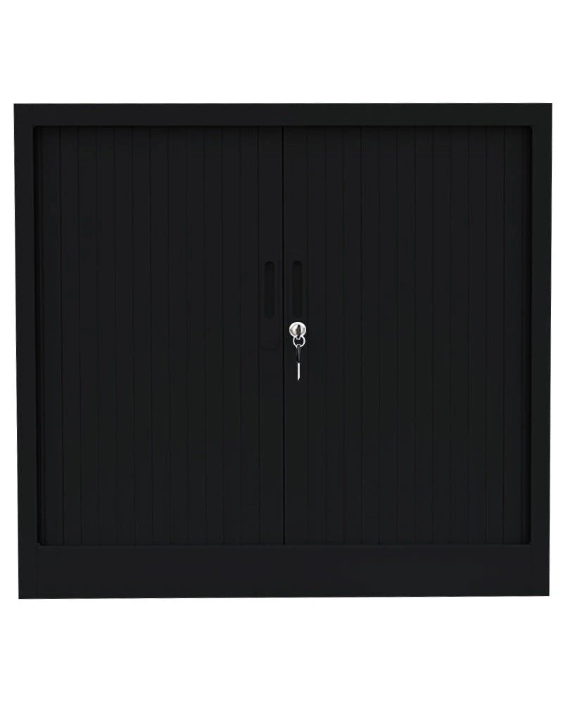 Hochwertiger Profi Stahl-Querrollladenschrank/Rollladenschrank 80 cm breit für Ihr Home Office oder im professionellen Büro-Einsatz. Der Stahl-Rollladenschrank verfügt über einen Einlegeboden (Traglast bis zu 50 kg) mit Platz für 1,5 übereinander gelagerte Ordner-Reihen (1,5 Ordnerhöhen). Die leichtgängigen und geräuscharmen Kunststoff-Querrollladentüren sind mit praktischen Griffmulden versehen für ein angenehmes und leichtes Öffnen.Die Rollladentüren sind verschließbar durch ein Hakenriegelschloss inkl. 2 Schlüssel und lassen sich beidseitig öffnen.Der Schrank ist fertig montiert, Sie müssen lediglich den Fachboden im höhenverstellbaren Raster einlegen. Maße: 750 x 800 x 460 mm (Höhe x Breite x Tiefe) Material: Langlebige, geschweißte Stahlblechkonstruktion, Kunststoff-Rollladentüren Farbe: Korpus RAL 9005 Schwarz, Türen RAL 9005 Schwarz