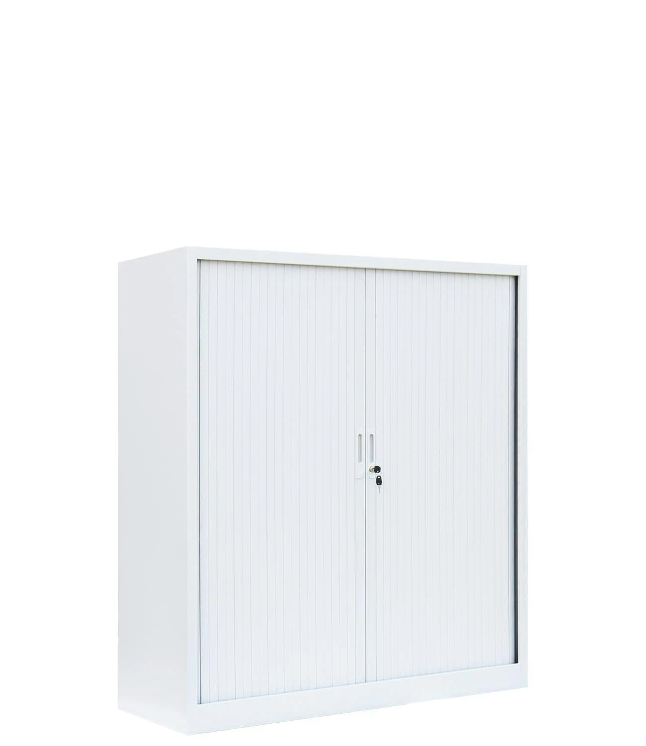 Rollladenschrank / Sideboard / Büro Aktenschrank WeißLanglebige, pflegeleichte, verschweißte Stahl-Konstruktion mit Kunststoff-Rollladentüren Optimal geeignet für enge Raumverhältnisse 2 Fachböden, 3 Ordnerhöhen Leichtläufige Kunststoff-Rollladentüren mit praktischen Griffmulden Fachböden im Raster höhenverstellbar Fachbodentragkraft bis 50 kg Fachböden serienmäßig in Korpusfarbe ausgeführt Bis 10 mm höhenverstellbare Bodengleiter zum Niveauausgleich Hakenriegelschloss inkl. 2 Schlüssel Korpus elektrostatisch, glatt pulverbeschichtet Qualität und Sicherheit Komplett verschweißt, keine Montage erforderlich, nur Böden müssen eingelegt werden Maße: 1350 x 1200 x 460 mm (HxBxT)Farbe: Korpus in RAL 9003 Weiß, Türen in RAL 9003 Weiß