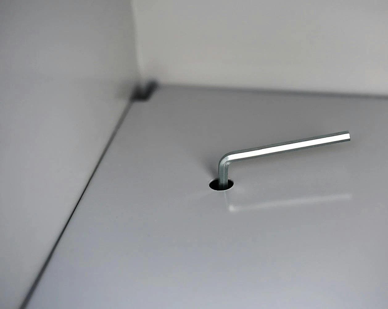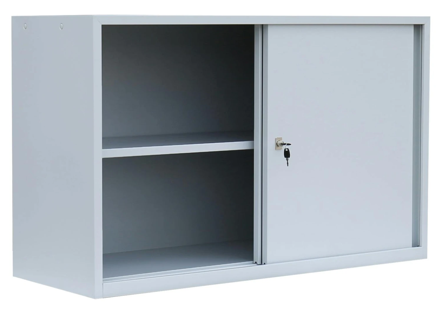 Schiebetürenschrank/Sideboard Langlebige, pflegeleichte, verschweißte Stahl-Konstruktion Optimal geeignet für enge Raumverhältnisse 2 Fachböden, 3 Ordnerhöhen Leichtläufige Schiebetüren in Schienenführung mit Kugellagerrollen und praktischen Griffmulden Serienmäßig mit geräuschdämpfenden Anschlagspuffern Fachböden im Raster höhenverstellbar Fachbodentragkraft bis 50 kg Fachböden serienmäßig in Korpusfarbe ausgeführt Bis 10 mm höhenverstellbare Drehfüße zum Niveauausgleich Dreh-Druckzylinderschloss inkl. 2 Schlüssel Korpus und Schubladen elektrostatisch, glatt pulverbeschichtet Qualität und Sicherheit Komplett verschweißt, keine Montage erforderlich Maße: 1090 x 1200 x 450 mm (HxBxT) Farbe: Korpus in RAL 7035 Lichtgrau, Türen in RAL 7035 Lichtgrau
