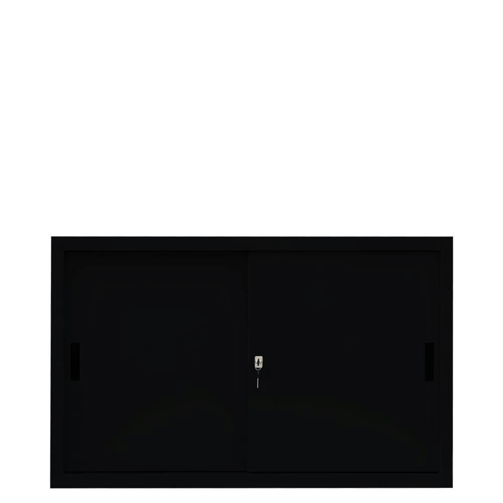 Schiebetürenschrank/ Sideboard Langlebige, pflegeleichte, verschweißte Stahl-Konstruktion Optimal geeignet für enge Raumverhältnisse 2 x 1 Fachboden (Trennwand in der Mitte), 2 Ordnerhöhen Leichtläufige Schiebetüren in Schienenführung mit Kugellagerrollen und praktischen Griffmulden Serienmäßig mit geräuschdämpfenden Anschlagspuffern Fachböden im Raster höhenverstellbar Fachbodentragkraft bis 50 kg Fachböden serienmäßig in Korpusfarbe ausgeführt Bis 10 mm höhenverstellbare Drehfüße zum Niveauausgleich Dreh-Druckzylinderschloss inkl. 2 Schlüssel Korpus und Schubladen elektrostatisch, glatt pulverbeschichtet Qualität und Sicherheit Lieferung: Komplett verschweißt, keine Montage erforderlich Maße: 750 x 1600 x 450 mm (HxBxT) Farbe: Korpus in RAL 9005 Schwarz, Türen in RAL 9005 Schwarz