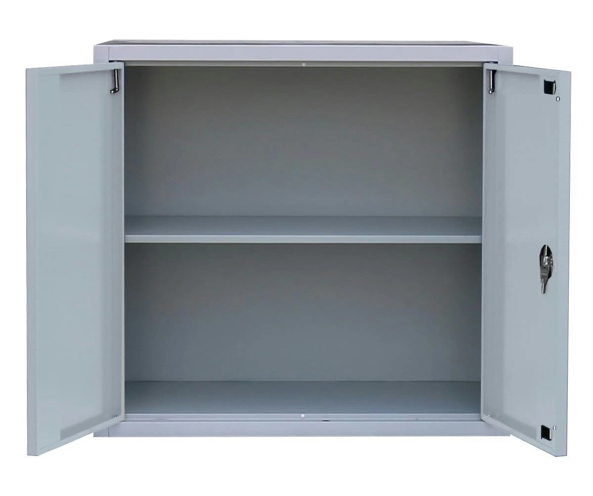 Aktenschrank, Büroschrank, Aktenschrank Metall, Ordnerschrank, Lagerschrank, Werkzeugschrank, mit 1x Fachboden (2 Ordnerhöhen).Universell einsetzbar zur Lagerung und Ablage von Aktenordnern und Dokumenten, zum sicheren Aufbewahren (abschließbar durch Schubstangen-Zylinderschloss) und Lagern von Werkzeug, Aufbewahrungsboxen, Verkaufsunterlagen, Katalogen, Papier und Schreibmaterial. Ideal geeignet für Büros, Logistik, Lager, Werkstätten sowie für den Privatgebrauch im Keller oder in der Garage 1 Fachboden, 2 OrdnerhöhenMaße: 750 x 800 x 383 mm (HxBxT)Schranktüren jeweils rechts und links angeschlagen, an gefederten Stiftscharnieren befestigt, mittig schließendKastenverstärkung für eine erhöhte Türstabilität Flexible Nutzung als Aktenschrank oder Regal durch herausnehmbare Flügeltüren Geräuschdämpfende Kunststoff-Türanschlagspuffer serienmäßig Individuelle, flexible Innen-Einteilung durch höhenverstellbare Einlegeböden, im 5 cm-Raster Tragkraft der herausnehmbaren Einlegeböden bis zu 65 kg Einlegeböden serienmäßig in Korpusfarbe ausgeführt 2-Wege-Schubstangenzylinderschloss mit Drehgriff, inkl. 2 Schlüssel Korpus und Türen elektrostatisch, glatt pulverbeschichtet Qualität und Sicherheit Langlebige, pflegeleichte, verschweißte Stahl-Konstruktion Komplett verschweißt, keine Montage erforderlich, nur Fachböden müssen eingelegt werdenFarbe: Korpus: Weiß, Türen: Weiß